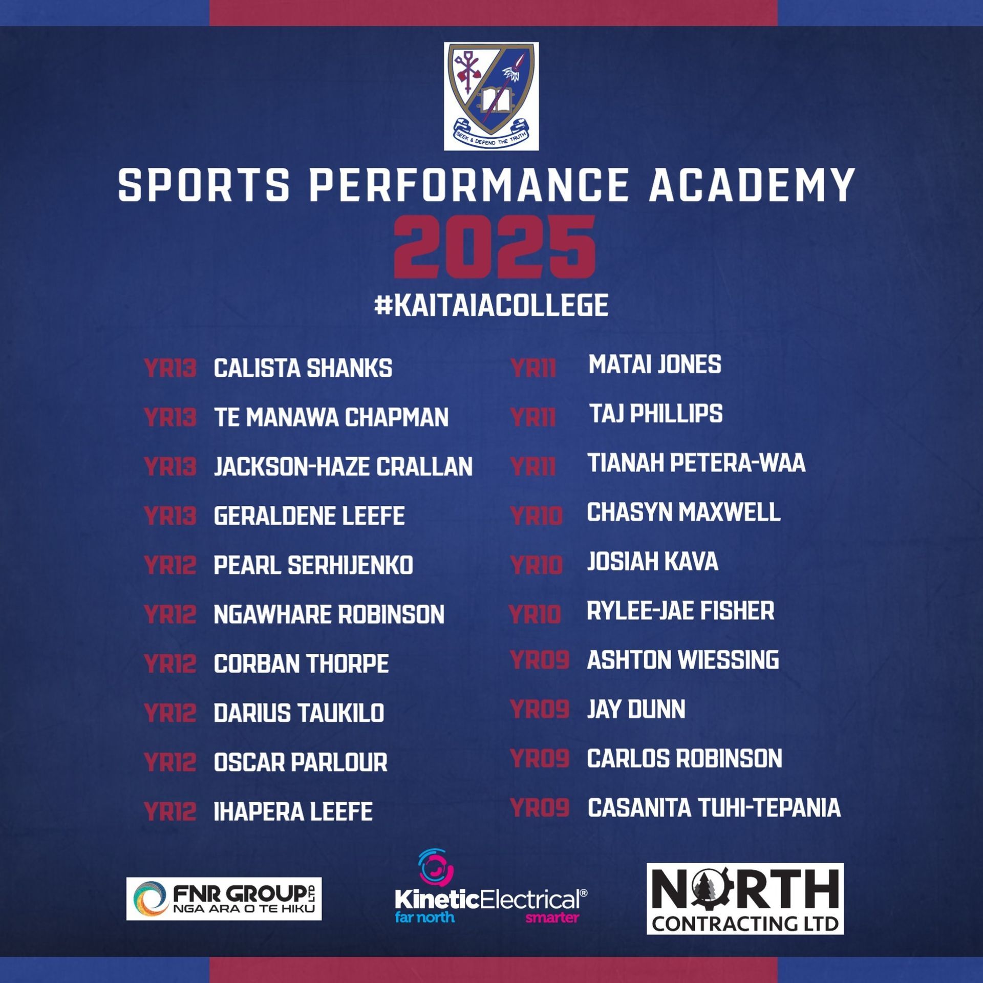 “Alongside Kinetic Electrical, we’d also like to acknowledge Northland Waste, Far North Roading (FNR), 9Tee Mile, North Contracting Ltd, and Adidas NZ. Their support has helped get the Academy off the ground and into action.”